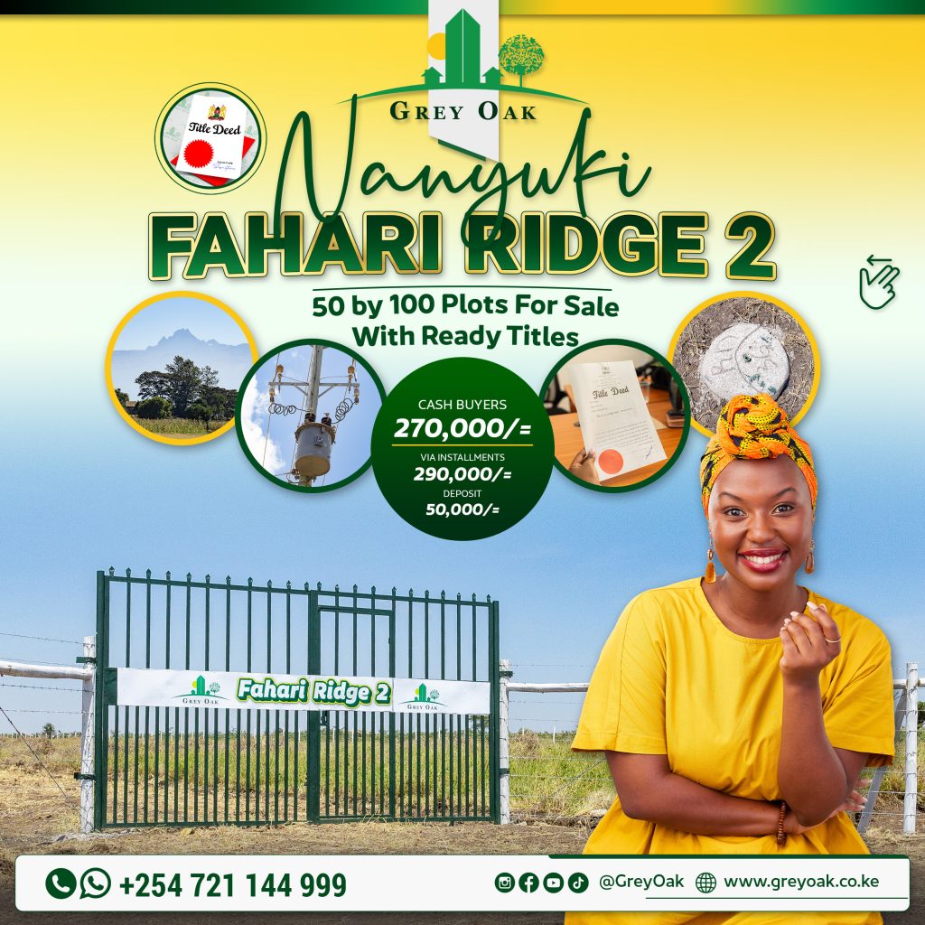 Our project in Nanyuki, Fahari Ridge phase 2, consists of 1/8th acre (50×100) plots located only 2.5km off tarmac and 20mins drive from Nanyuki town. The plots have ready titles and flexible payment plans.